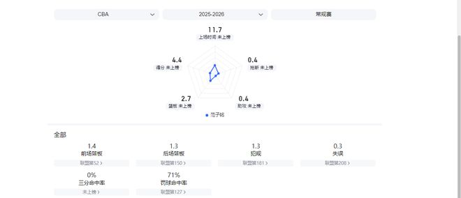 24-25賽季常規(guī)賽,范子銘場均6.9分4籃板;本賽季7輪過后,他場均4.4分2.7籃板。從數(shù)據(jù)上看,很難看出他是一名拿頂薪合同的球員。