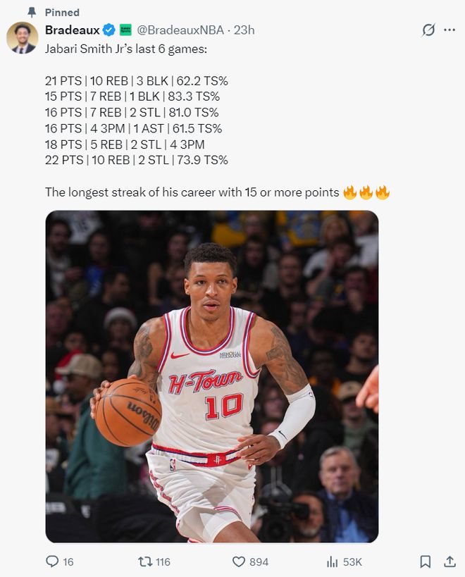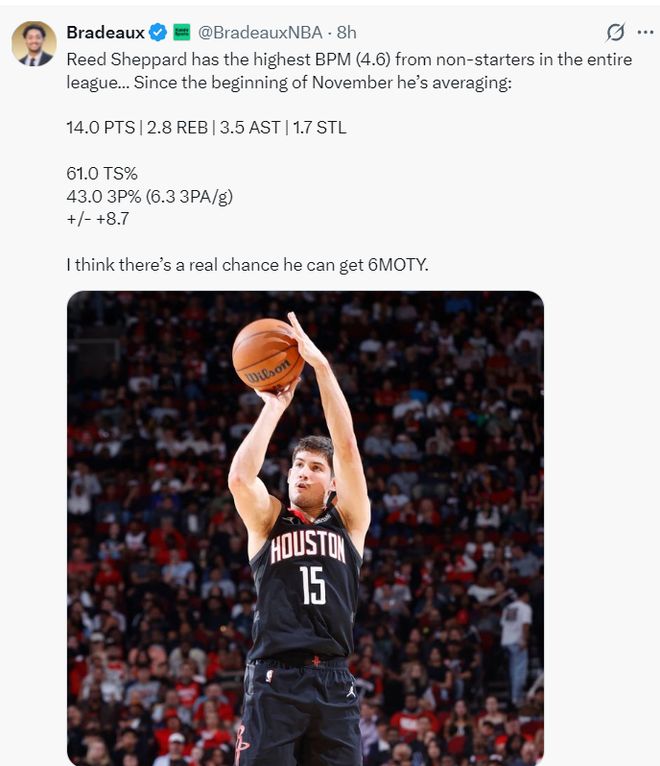 他還表示謝潑德自11月以來,他是非先發(fā)BPM最高(4.6)的球員,場均拿到14分2.8籃板3.5助攻1.7搶斷,真實命中率61%,三分命中率43%,正負(fù)值+8.7,謝潑德是最佳第六人的有力爭奪者。
