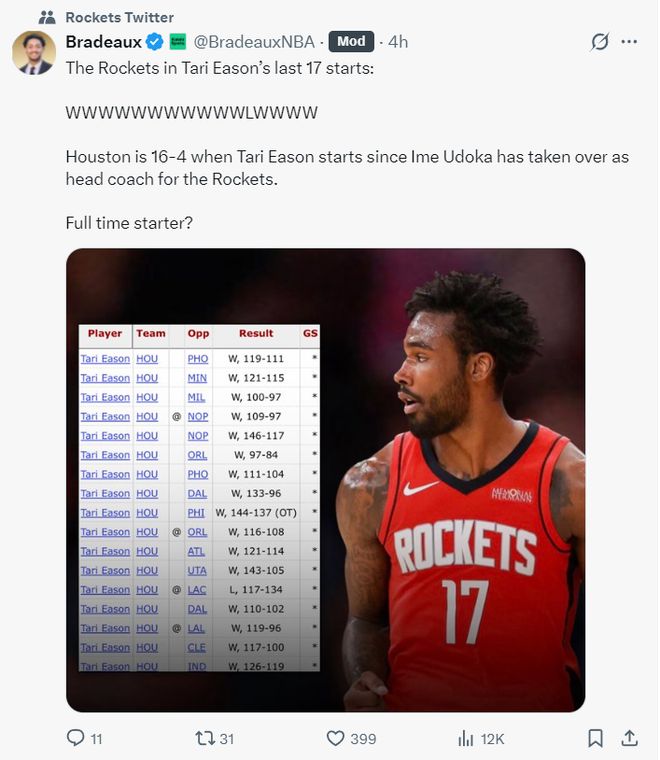 伊森登場先發(fā)的17場比賽拿到了16勝1負(fù)的戰(zhàn)績,自烏度卡時期伊森先發(fā)的比賽火箭隊是16勝4負(fù),所以伊森打先發(fā)也算是火箭的一個妙招、奇招。
