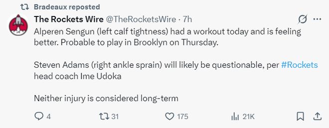 烏度卡在訓(xùn)練后的采訪說道:申京的左腿肌肉緊張已經(jīng)沒有大礙,今天進(jìn)行了訓(xùn)練感覺好多了,大概率在對陣籃網(wǎng)的比賽中會復(fù)出。亞當(dāng)斯右腳踝的傷勢還不明確但不是長期的傷勢。(火箭下一場是2月2日還有兩天的休息時間)