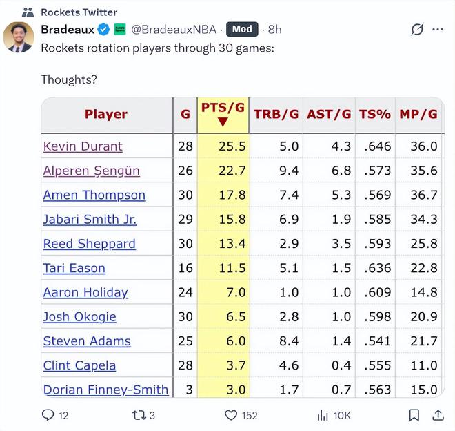 火箭記者Bradeaux總結(jié)了球隊前30場比賽,戰(zhàn)績20勝10負(fù)西部第四,杜蘭特25.5分第一,申京22.7第二,阿門17.8分第三,小賈15.8分第四,謝潑德13.4分第五,伊森11.5分第五,火箭五人上雙。