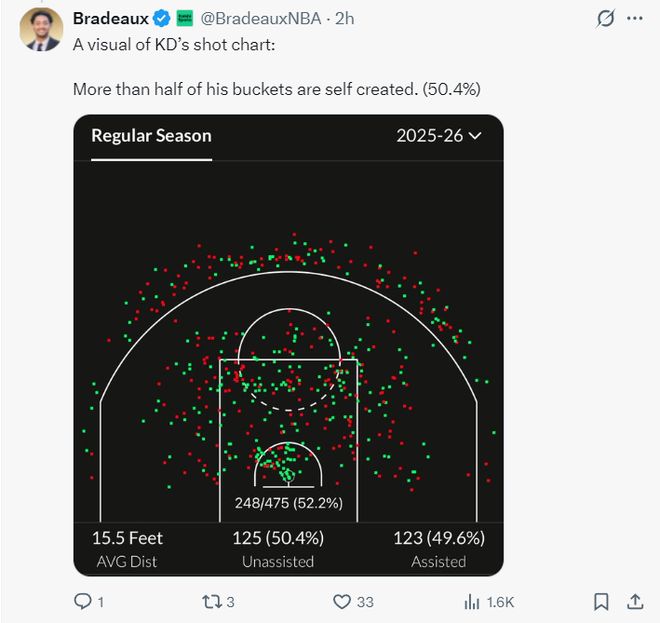 杜蘭特更強悍,37歲的他命中率52.2%,三分命中率43.7%,而且他的出手占比有50.4%是自主創(chuàng)造的進(jìn)攻機(jī)會,這樣的KD依舊還在巔峰。
