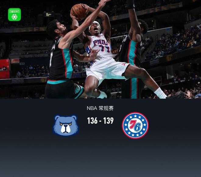 加時(shí)賽,上來灰熊連續(xù)反擊迅速領(lǐng)先4分,隨后76人喬治、恩比德站出來反超比分,灰熊還是莫蘭特站出來沖框追平比分,最后時(shí)刻76人埃奇庫姆三分準(zhǔn)絕殺,最后1.7秒灰熊考沃德三分不中,最終灰熊136-139不敵76人。