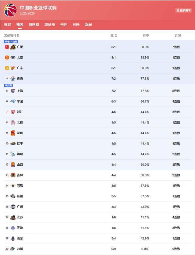 本輪其他比賽中,浙江隊(duì)爆冷擊敗青島隊(duì),以4勝5負(fù)的戰(zhàn)績悄然升至第七,成為季后賽席位的有力競爭者。而遼寧隊(duì)則遭遇連敗,排名跌至第十,跌出前八行列。黑馬青島隊(duì)雖然輸給浙江,但仍以7勝2負(fù)的戰(zhàn)績排在第四,成績喜人,上海隊(duì)同樣戰(zhàn)績緊隨其后。