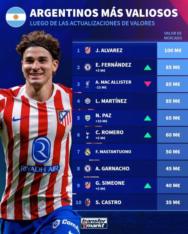北京時(shí)間12月27日,德轉(zhuǎn)列出了目前阿根廷身價(jià)最高的10名球員,胡利安-阿爾瓦雷斯以1億歐元的身價(jià)高居第一,恩佐-費(fèi)爾南德斯、麥卡利斯特以及勞塔羅同以8500萬(wàn)歐元并列第二。