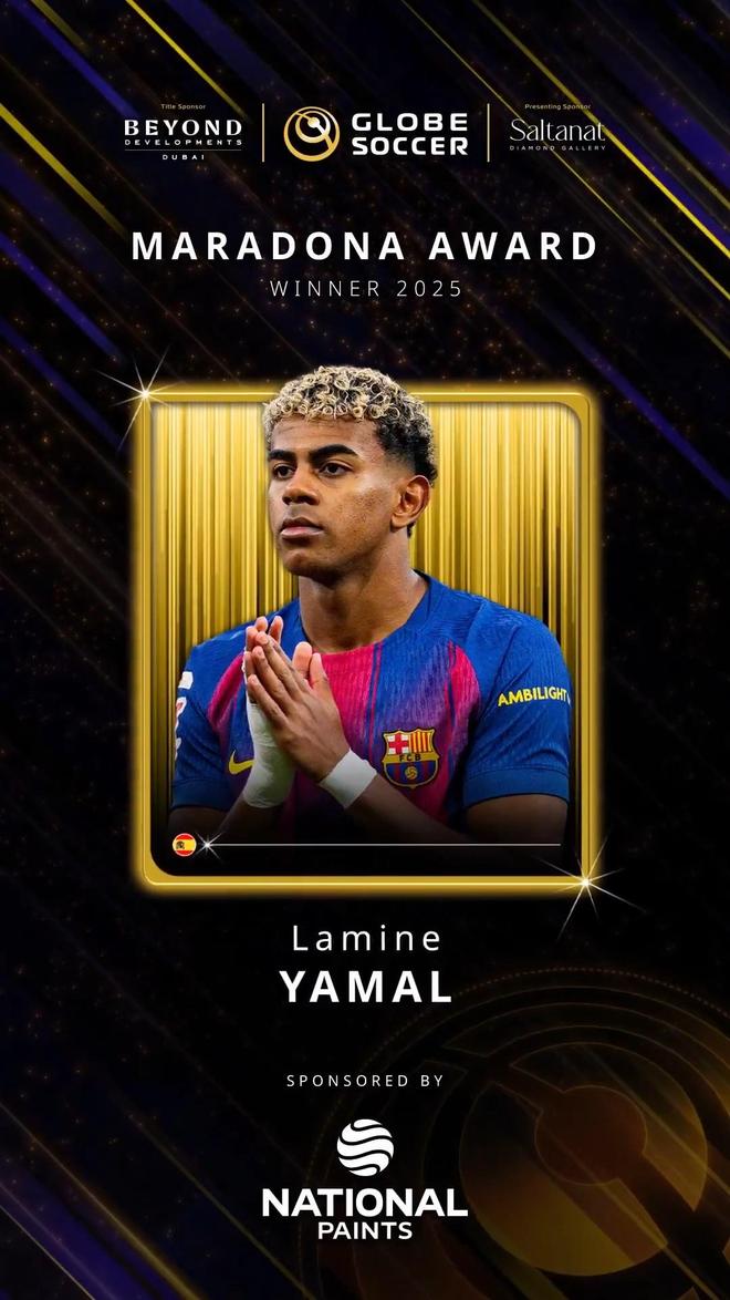 官方消息,巴塞羅那當家新星亞馬爾榮獲環(huán)球足球獎2025年馬拉多納獎。