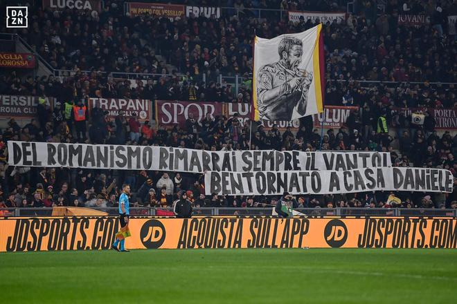 比賽進行到第10分鐘,看臺上掛出了第一批橫幅。南看臺寫道:“這里永遠是你的家,歡迎回家,DDR?!迸_伯河看臺回應:“羅馬精神的驕傲永遠屬于你,歡迎回家,達尼埃萊?!?/p>