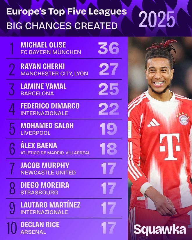 2025年即將結(jié)束,知名數(shù)據(jù)機(jī)構(gòu)Squawka統(tǒng)計(jì)了五大聯(lián)賽本年度創(chuàng)造絕佳機(jī)會(huì)數(shù)據(jù),拜仁攻擊手奧利塞高居榜首,曼城中場(chǎng)謝爾基位列次席。