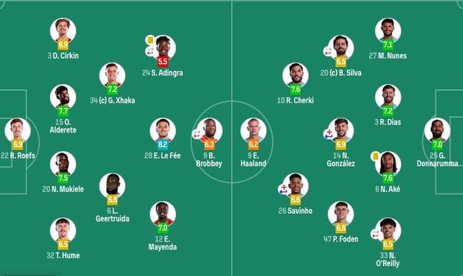 曼城首發(fā):25-多納魯馬、27-努內(nèi)斯、3-魯本·迪亞斯、6-阿克、33-奧賴?yán)?4-尼科·岡薩雷斯(46'16-羅德里)、20-B席(85'4-賴因德斯)、26-薩維尼奧(51'11-多庫)、47-福登、10-謝爾基、9-哈蘭德