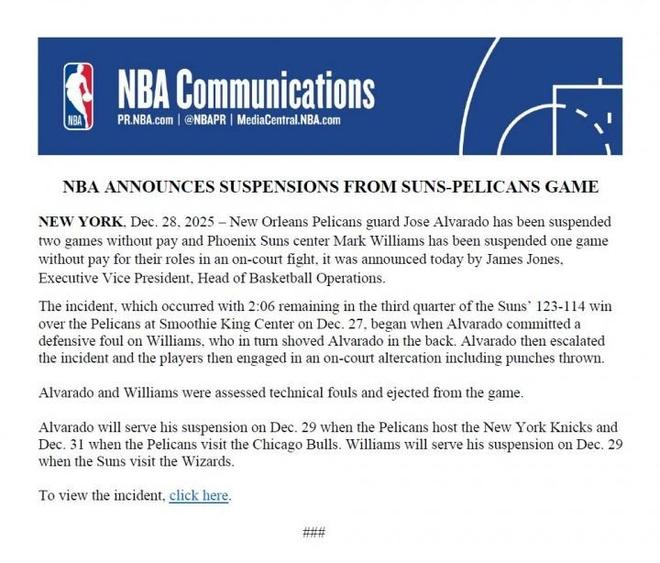 在太陽123-114賽季三殺鵜鶘的比賽,阿爾瓦拉多與馬威在第三節(jié)末段爆發(fā)沖突互毆。如今根據(jù)名記Shams報(bào)道,NBA宣布阿爾瓦拉多禁賽2場(chǎng)與損失8萬美元,馬威禁賽1場(chǎng)與損失6萬美元。