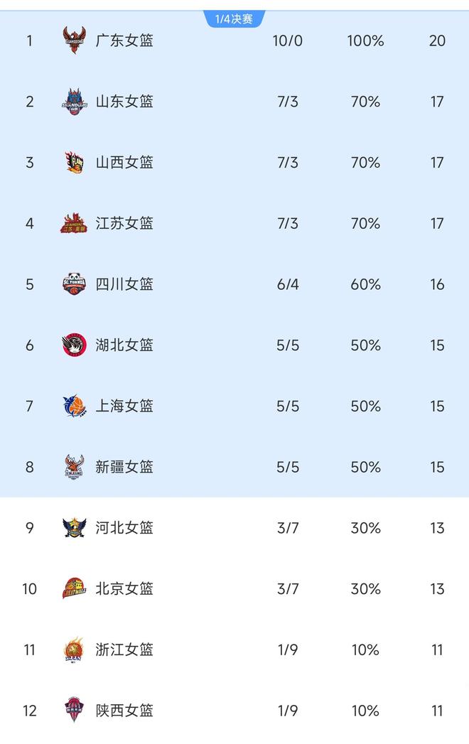 主要競爭對手里面,四川女籃中,李夢、韓旭出國,王思雨一直養(yǎng)傷,實(shí)力下滑。內(nèi)蒙古女籃退出。如今來看,新賽季的WCBA呈現(xiàn)出來了新的局面:廣東保持強(qiáng)勢態(tài)勢,十連勝一路領(lǐng)先。緊隨其后的是山東、山西和江蘇。這是最新的WCBA聯(lián)賽積分榜: