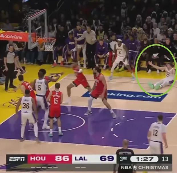 和火箭的第三節(jié),有這么一幕:東契奇因為對判罰不滿,直接坐在地上攤手,結果火箭順勢打反擊。
