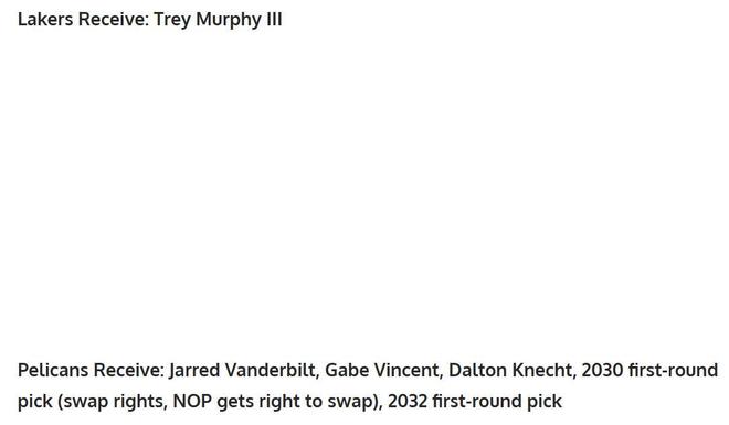 這筆交易方案基于此前名記Evan Sidery的報道,湖人一直有意得到瓊斯與墨菲,兩人都是頂級3D側(cè)翼球員,完美符合湖人隊(duì)的補(bǔ)強(qiáng)需求。