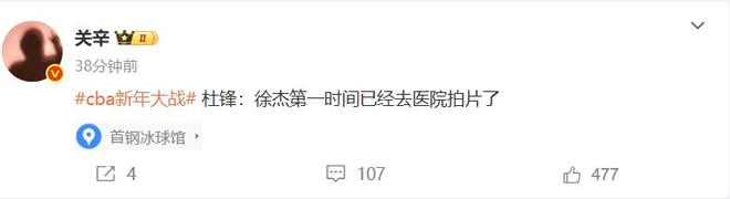 接下來廣東隊還有多場硬仗要打,下一輪將繼續(xù)客場挑戰(zhàn)北控,緊接著還要迎來浙江、深圳的2場硬仗,徐杰的傷情關(guān)系到球隊接下來能否繼續(xù)爭勝,在徐杰受傷下場階段,現(xiàn)場記者關(guān)辛表示:徐杰已經(jīng)第一時間去醫(yī)院拍片了。