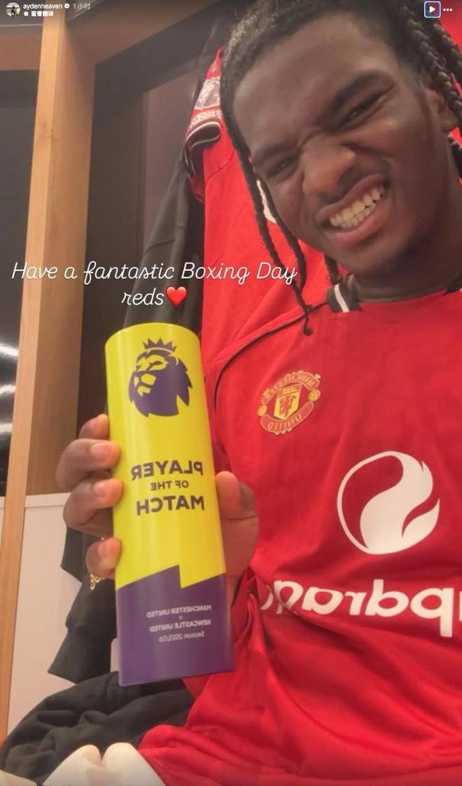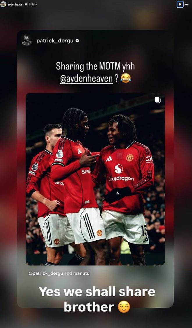 英超第18輪,曼聯(lián)主場1-0擊敗紐卡斯?fàn)柭?lián),此役表現(xiàn)出色的曼聯(lián)后衛(wèi)艾登-海文被現(xiàn)場評為全場最佳球員,并在社交媒體曬出了獎(jiǎng)杯,多古在社交媒體詢問是否可以分享全場最佳,海文回復(fù)道:“當(dāng)然。”